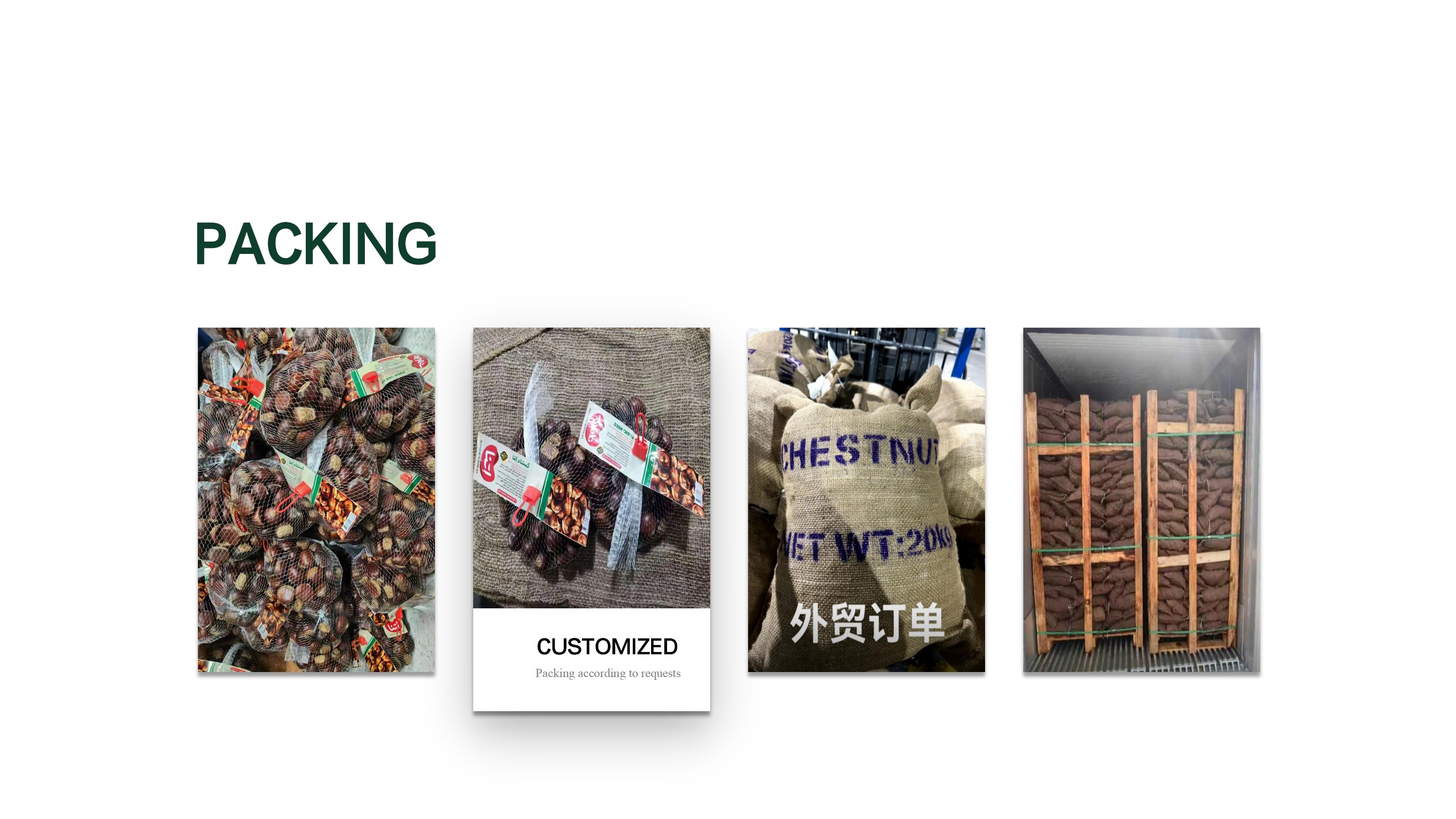 Taishan chestnut:80-100,100-130, 130–150 pcs/kg; 150–180 pcs/kg |
